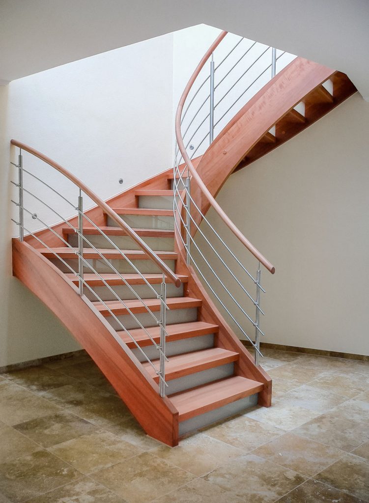 Wangentreppe – Objekt 8 Moderne Holztreppe komplett in Buche massiv blockverleimt Grundriss ¼ gewendelt, mit offener Blockstufe | formverleimte Innenwangen und Handlauf | Handlauf in Sonderprofilierung | Geländer in Edelstahl/Holz Kombination