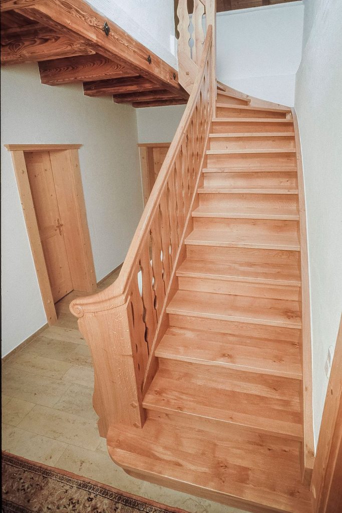Wangentreppe – Objekt 2 Klassische Holztreppen komplett in Esche mit Braunkern massiv blockverleimt Wendestellen mit Wangen- und Handlaufkrümmlinge | Handlauf in Omegaform über die Pfosten laufend | Stäbe gedrechselt, Oberfläche geölt