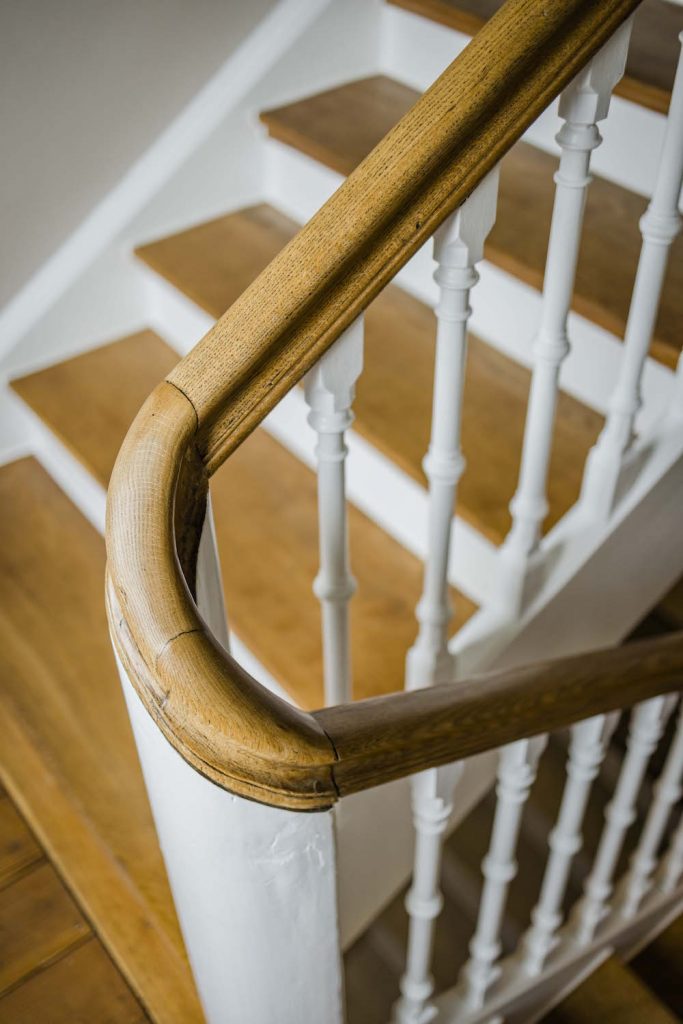 Wangentreppe – Objekt 10 Klassische Holztreppe Stufen und Handlauf in Eiche massiv blockverleimt, andere Bauteile Schleiflack weiß Grundriss 2 x 1/4 gewendelt | Antrittspfosten in Sonderausführung | Wangen- und Handlaufkrümmlinge Handlauf in Omegaform | Stäbe gedrechselt