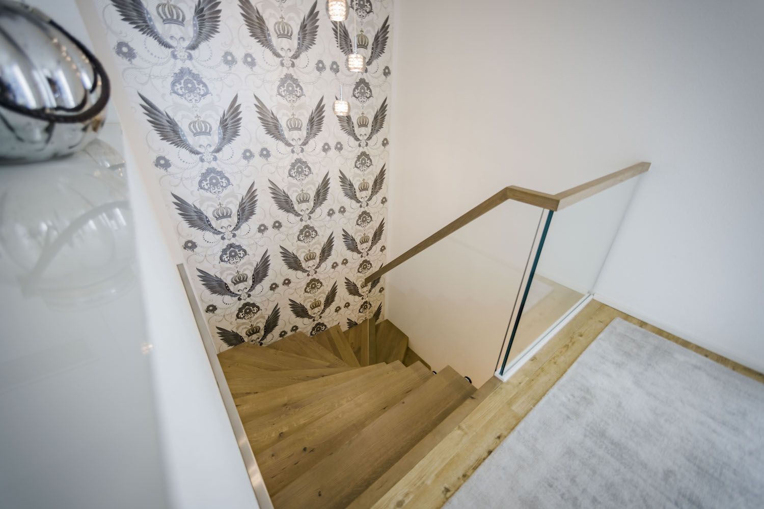 Einbau zwischen Wänden und Schrankunterbau | Geländer als Ganzglasgeländer mit eckigem Holzhandlauf