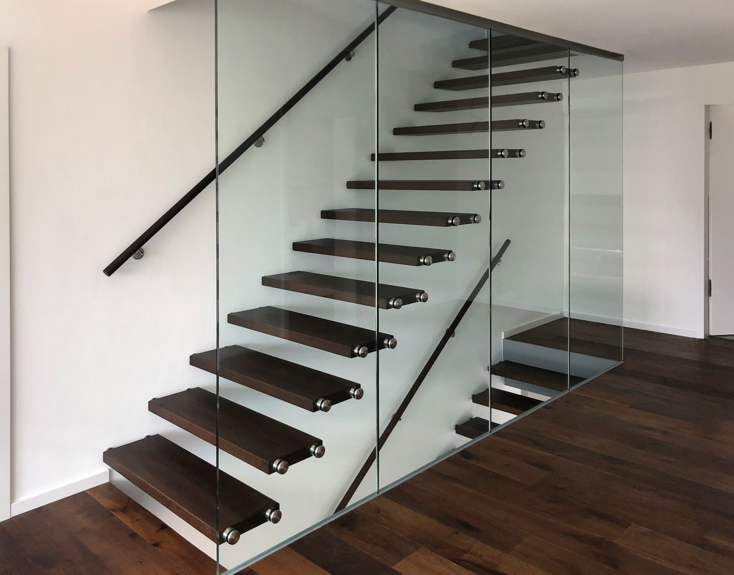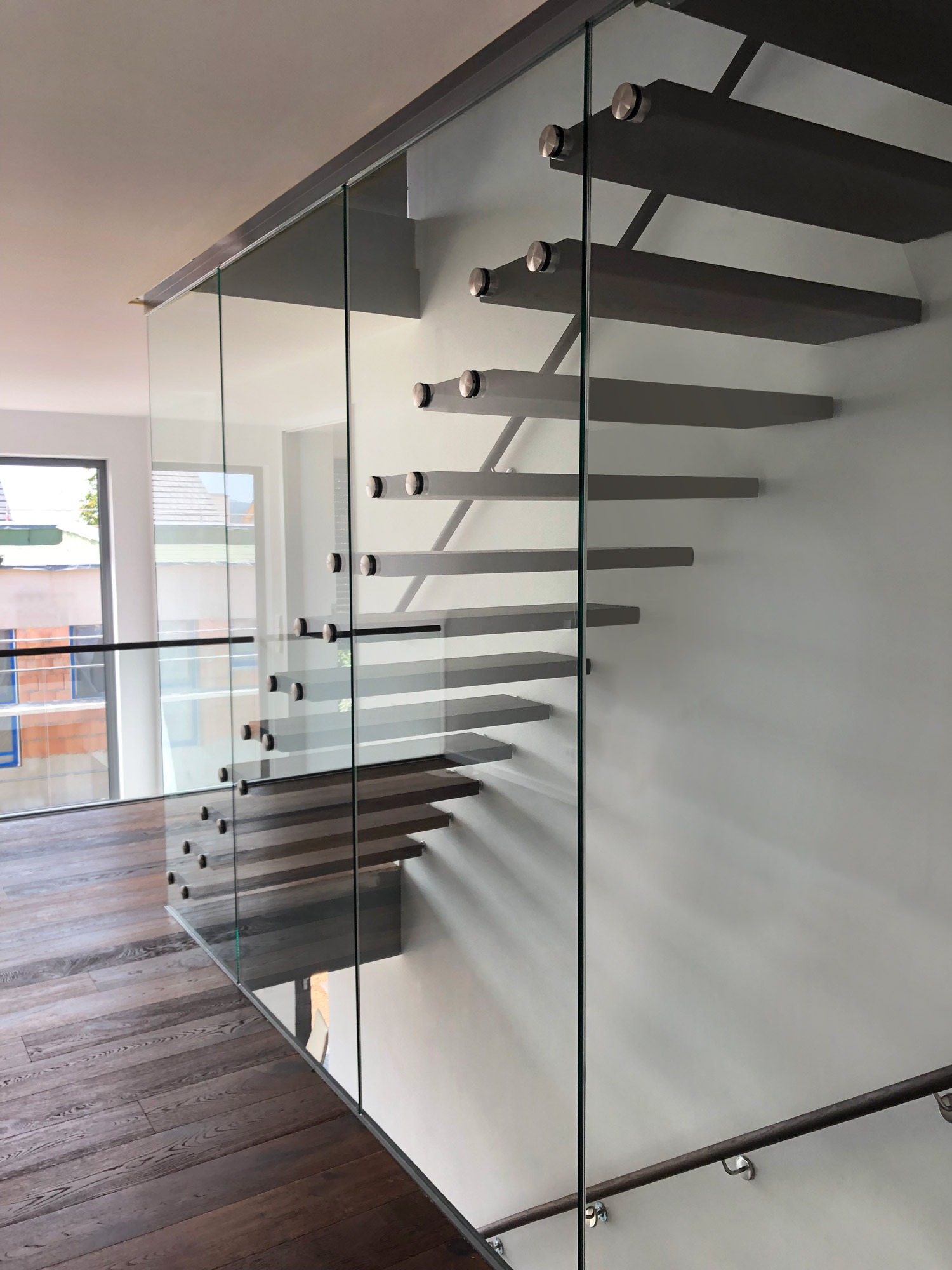 Wandseitig gummigelagert | Innenseite an der Raumhohe Glaswand befestigt | Ganzglasgeländer als waagrechtes Brüstungsgeländer | runder Wandhandlauf mit LED Beleuchtung