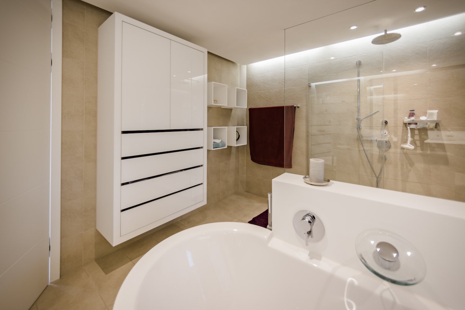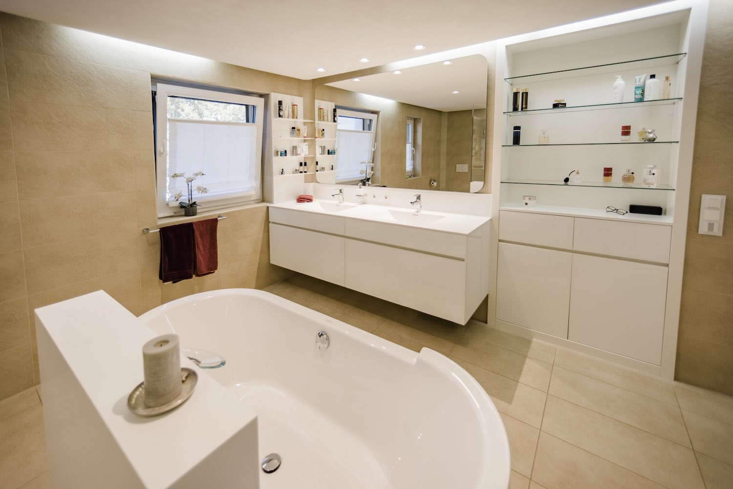 Von uns entworfenes Badezimmer Interieur ist nicht nur individuell an Ihre Bedürfnisse angepasst, sondern bildet auch einen harmonischen Einklang mit den ausgewählten Sanitäranlagen.
