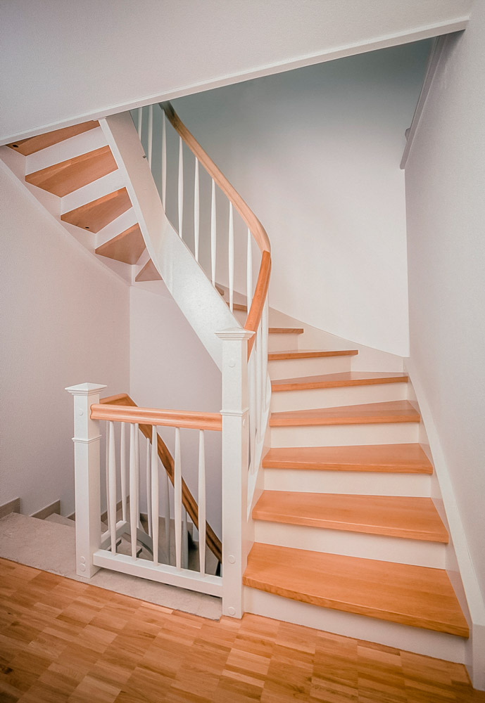 Klassische Holztreppe Stufen und Handlauf in Eiche massiv blockverleimt, andere Bauteile Schleiflack weiß