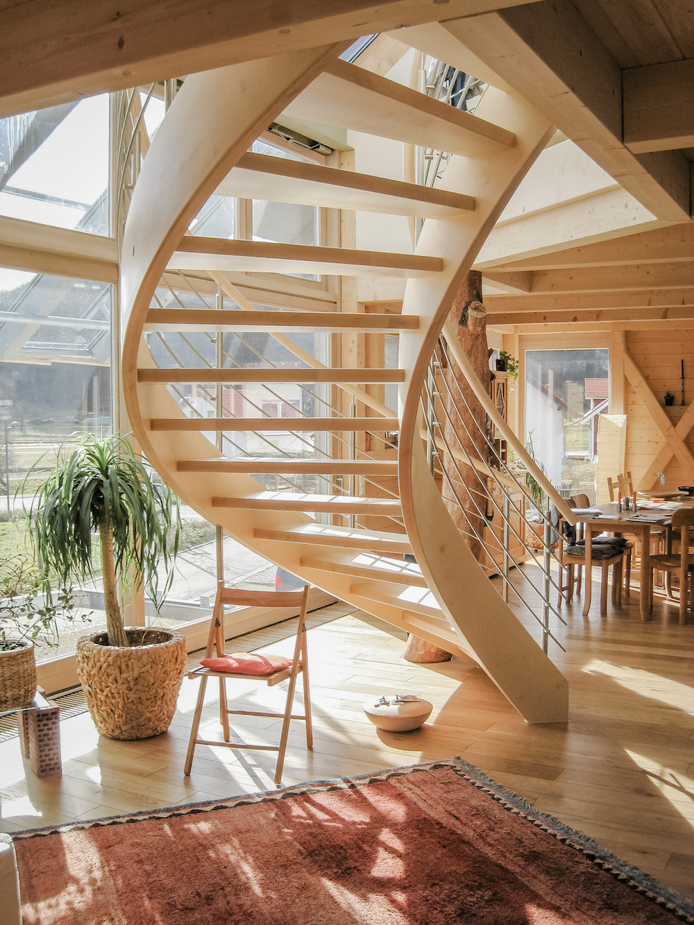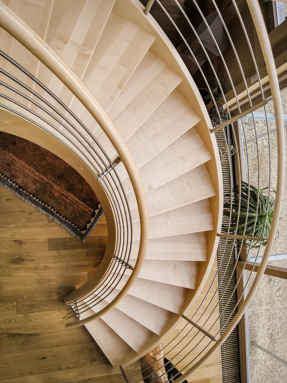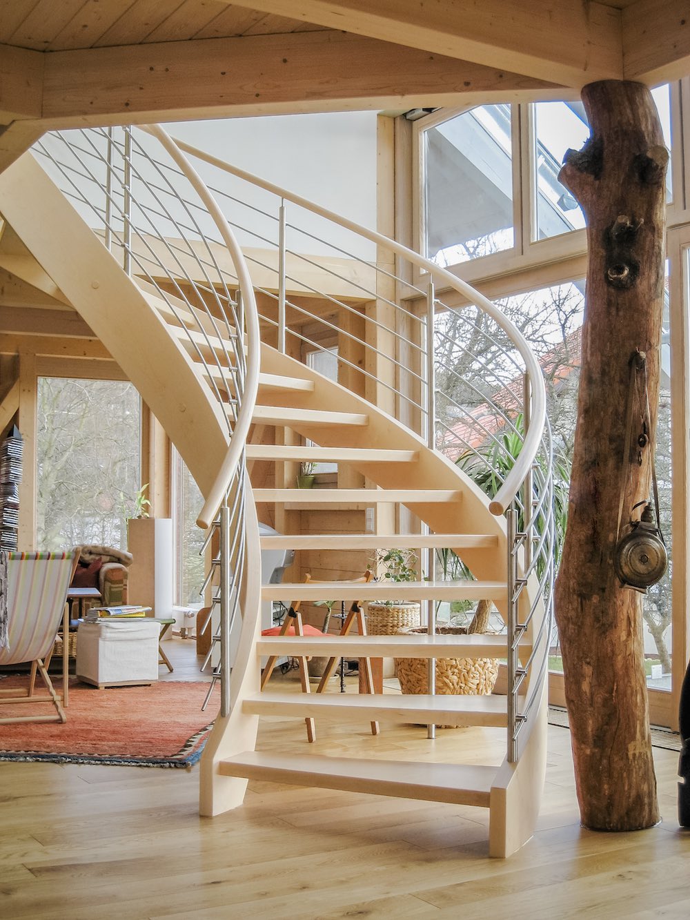 Grundriss bogenförmig, mit beidseitig formverleimten Wangen und Handläufen | Geländer mit Rundhandlauf, parallele Füllstäben in Edelstahl | senkrechte Stabilisierungspfosten in Edelstahl