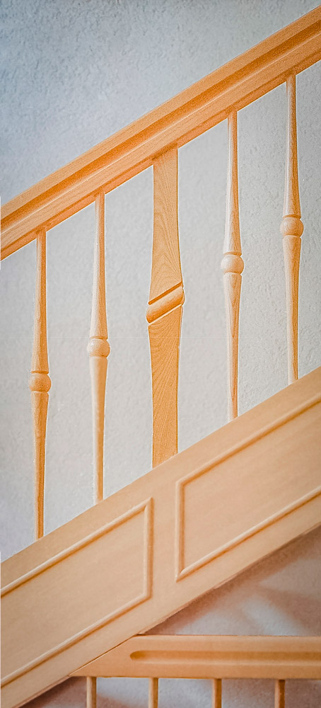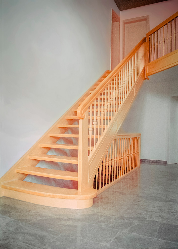 Grundriss geradläufig mit gerundeter Blockstufe | gedrechselte Treppenstäbe | Handlauf moderne Form mit Griffmulde Antrittspfosten mit Handlaufschnecke | Wangen mit aufgesetzten Profilleisten